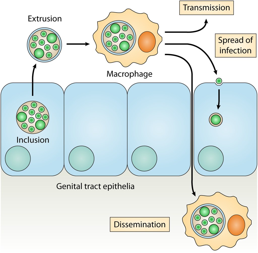 Zuck M, Sherrid A, Suchland R, Ellis T, Hybiske K. Conservation of extrusion as an exit mechanism for Chlamydia. Pathog Dis. 2016 Oct;74(7):ftw093. PMCID: PMC5985487